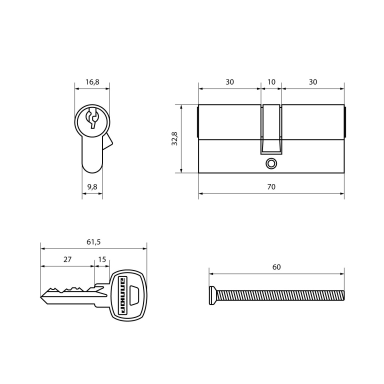 Комплект из цилиндровых механизмов одинаковой секретности для врезных замков. В комплекте 3 цилиндра и 5 английских ключей. Материал корпуса и ключей — латунь. Ключ-ключ. Механизм защищен от высверливания специальным стержнем. Выступающий на 30 градусов из плоскости механизма кулачок защищает цилиндр от выбивания из двери. Длина механизма — 70 мм (30×10×30). Упаковка — блистер.