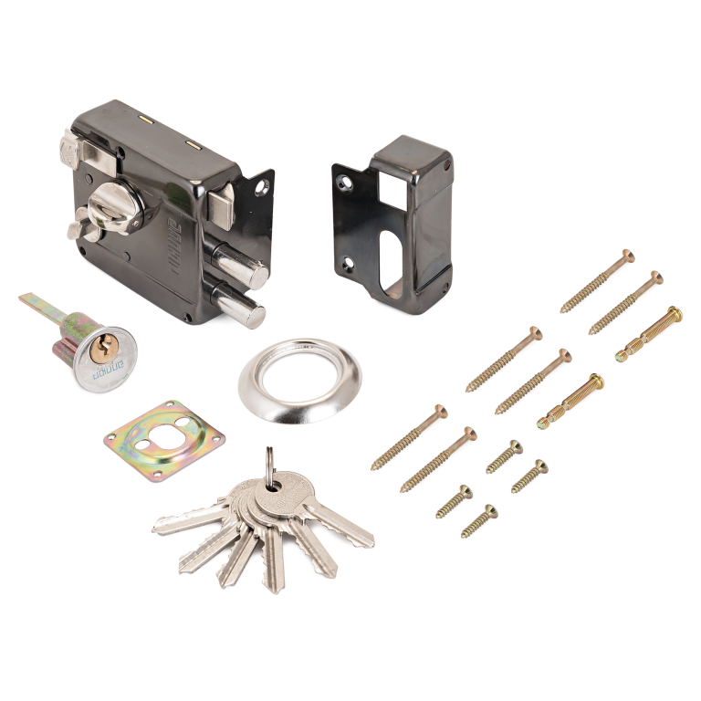 Замок накладной цилиндровый с вертушкой, фиксатором и защелкой, предназначенный для установки на деревянные двери. Засов состоит из двух цилиндрических ригелей диаметром 12 мм с максимальным вылетом 22 мм. Удаление ключевого отверстия составляет 50 мм. Габариты замка: 86×77×25 мм. В комплект входят 5 ключей, запорная планка и накладка. Механизм замка под английский ключ поставляется отдельно от корпуса.