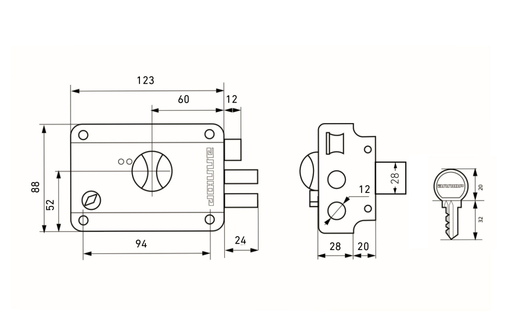 Засов из двух цилиндрических ригелей диаметром 12 мм, с максимальным вылетом 22 мм. Удаление ключевого отверстия -