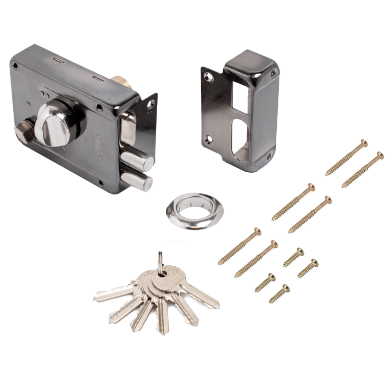 англ.ключ, идет совместно с корпусом. Закрывание и открывание замка изнутри производится вертушкой, снаружи ключом.