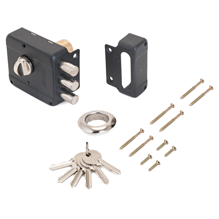 Замок накладной цилиндровый с вертушкой. Предназначен для установки на деревянные двери. Засов состоит из трех цилиндрических ригелей диаметром 12 мм с максимальным вылетом 22 мм. Удаление ключевого отверстия составляет 50 мм. Габариты замка: 86×77×25 мм. В комплект входят 5 ключей, запорная планка и накладка. Механизм замка под английский ключ встроен в корпус. Закрывание и открывание замка изнутри происходит с помощью вертушки, снаружи - ключом. Замок совместим по посадочным местам с замками моделей 556 и LT 556.