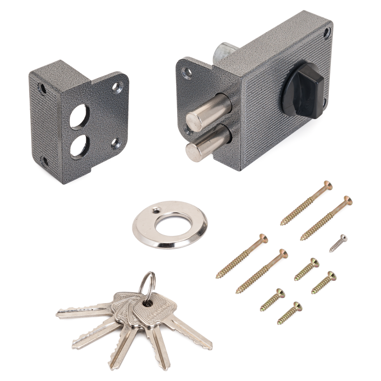 Замок накладной цилиндровый с вертушкой, предназначен для установки на деревянные двери. Засов состоит из двух цилиндрических ригелей диаметром 14 мм с максимальным вылетом 30 мм. Удаление ключевого отверстия составляет 60 мм. Размеры замка: 100×75×25 мм. В комплект входит 5 ключей, запорная планка и накладка.