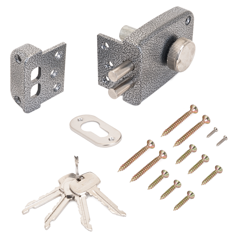 Замок накладной цилиндровый с вертушкой предназначен для установки на деревянные двери. Засов состоит из двух цилиндрических ригелей диаметром 12 мм с максимальным вылетом 24 мм. Удаление ключевого отверстия составляет 55 мм. Габаритные размеры замка: 100×75×18 мм. В комплект входят 5 ключей, запорная планка и накладка. Механизм замка под английский ключ поставляется в комплекте с корпусом. Закрывание и открывание замка изнутри производится вертушкой, снаружи — ключом. По посадочным отверстиям этот замок совпадает и совместим с замком ЗН1-1Д.