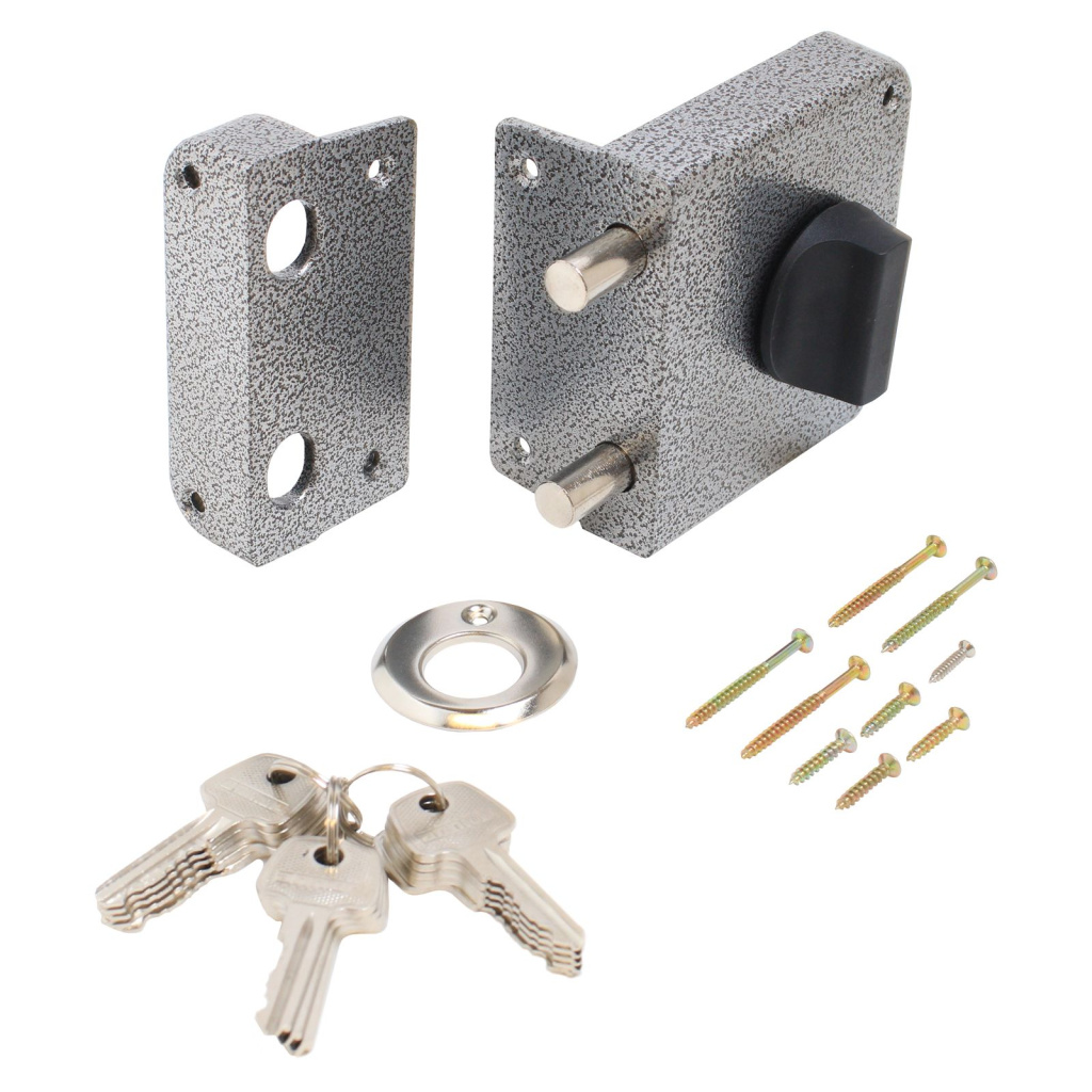 Два засова круглого сечения диаметром 13 мм с максимальным вылетом 28 мм. Удаление ключевого отверстия - 60 мм. Габариты замка - 100×110×55 мм.
