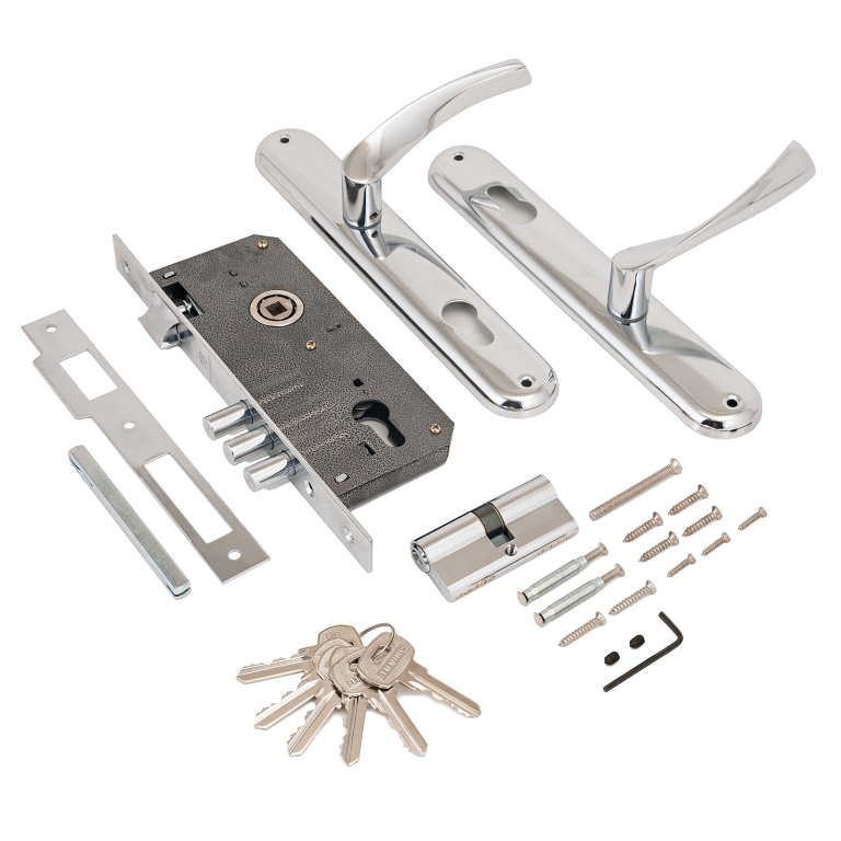 - Врезные замки с ручками для деревянных дверей