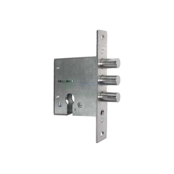 Замок цилиндровый, без механизма. Предназначен для установки в металлические и деревянные двери, металлические шкафы и сейфы. Имеет три цилиндрических ригеля диаметром 13,5 мм и вылетом 26 мм. Удаление ключевого отверстия составляет 50 мм. Стальная торцевая планка покрыта никелем, ширина планки 26 мм.