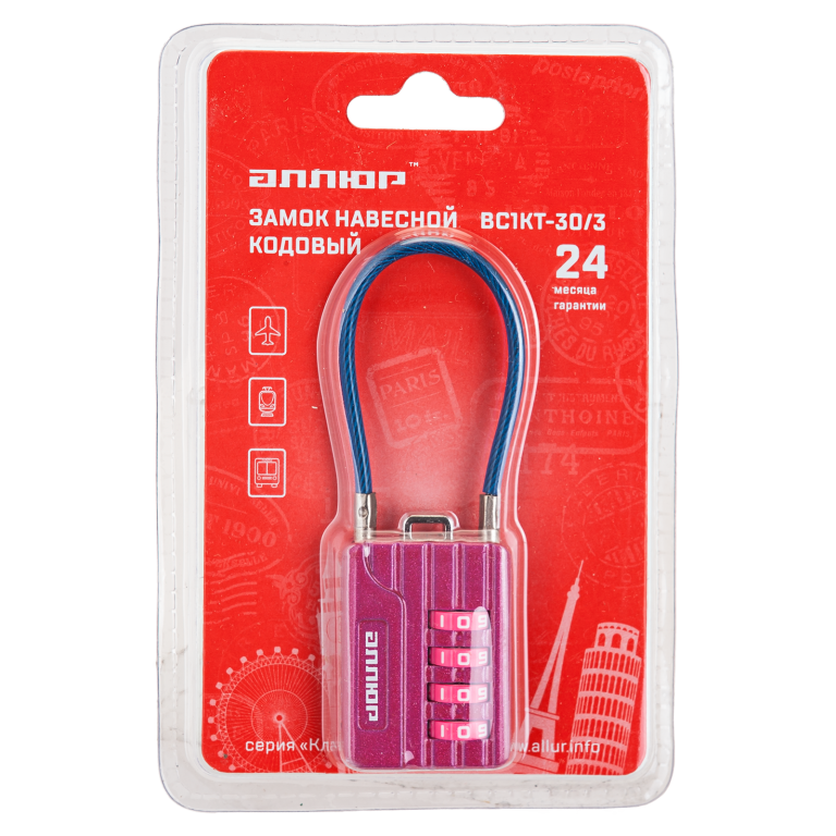 АЛЛЮР ВС1КТ-30/3 (H2) розовый с тросиком кодовый d=3мм Замок навесной