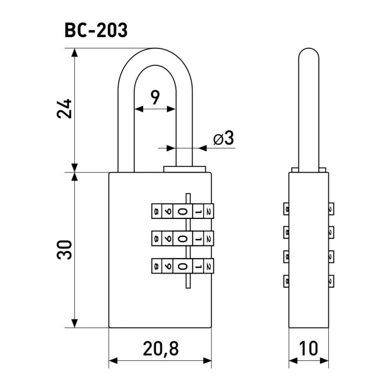 Замок кодовый 3-х цифровой. Предназначен для защиты багажа, шкафов, ящиков. Замок запирается дужкой из стали диаметром 3 мм. Проем дужки 21 мм по высоте и 9 мм по ширине. Габариты замка - 20,8х54 мм.