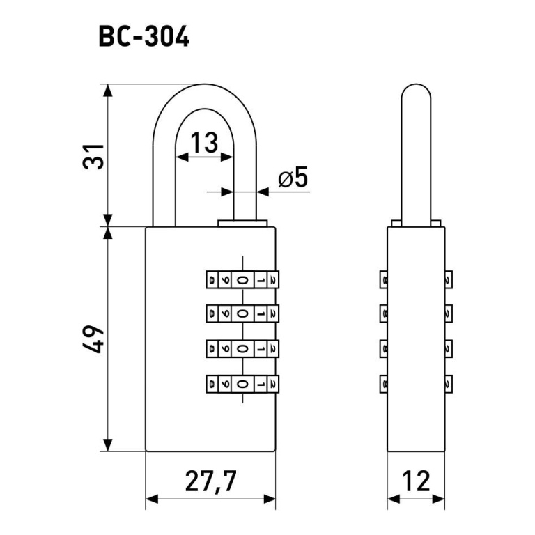 Замок кодовый 4-х цифровой. Предназначен для защиты багажа, шкафов, ящиков. Замок запирается дужкой из стали диаметром 5 мм. Проем дужки 26 мм по высоте и 13 мм по ширине. Габариты замка - 27,7х80 мм.