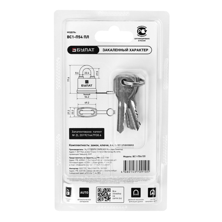 БУЛАТ ВС 1-П54 ПЛ всепогодный 5 кл. d=8,6мм Замок навесной
