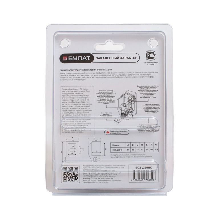 БУЛАТ ВС 3-Д50 НС нержавеющая сталь 3кл. d=12мм Замок навесной