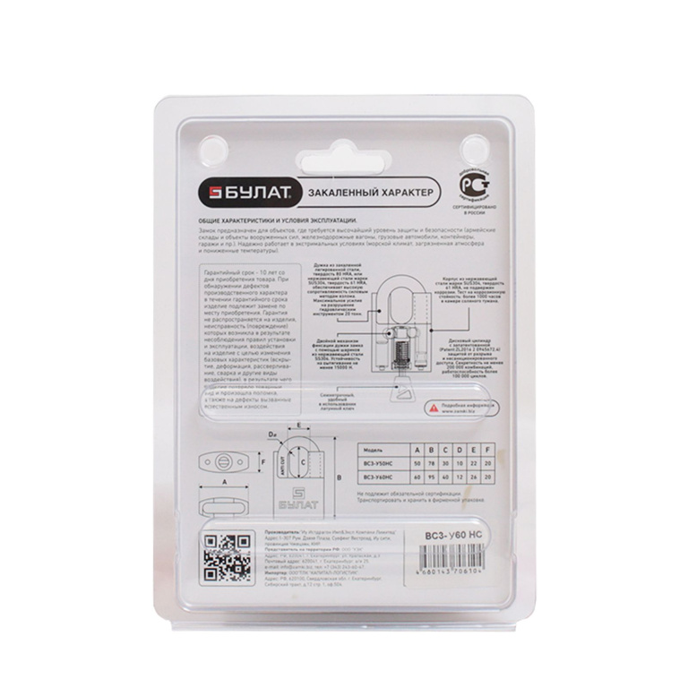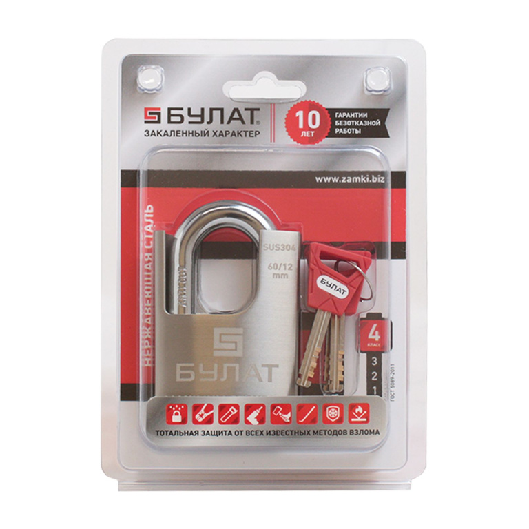БУЛАТ ВС 3-У60 НС нержавеющая сталь 3кл. d=12мм Замок навесной