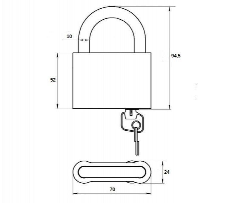 Замок навесной цилиндровый с 4 ключами. Материал корпуса - силумин ( или аналог, сплава АК5М2), покрытие - полимерная краска. Стальная дужка диаметром 10 мм; проем дужки - 30 мм по высоте и 40 мм по ширине. Габариты корпуса - 70х95х24 мм. Индивидуальная упаковка - пакет полиэтиленовый.