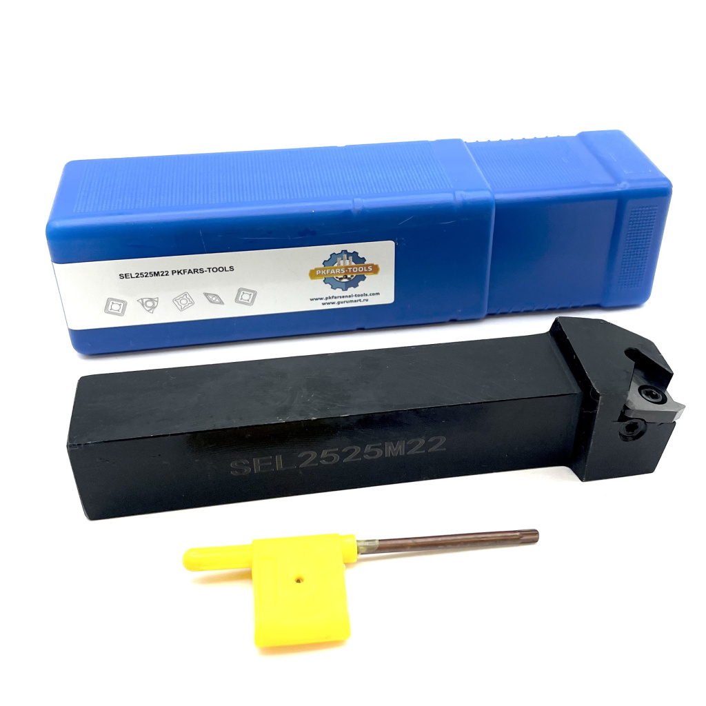 Резец резьбовой по металлу со сменными пластинами. Для пластин стандарта ISO 22EL. Крепление типа S, для наружной обработки. Левое исполнение с углом наклона 10°.