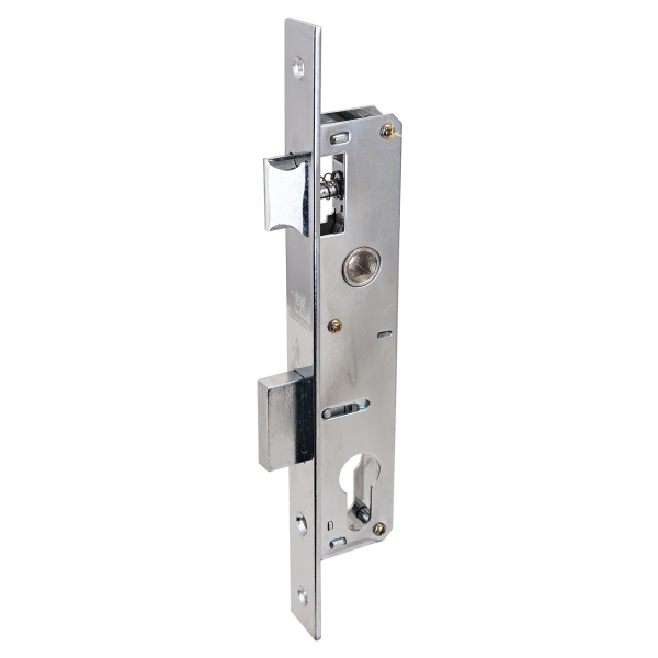 Замок врезной цилиндровый, без механизма. Предназначен для установки в узкопрофильные двери. Прямой ригель. Удаление ключевого отверстия 21мм. Межосевое расстояние 85мм. Цвет торцевой планки - хром, ширина 23мм.